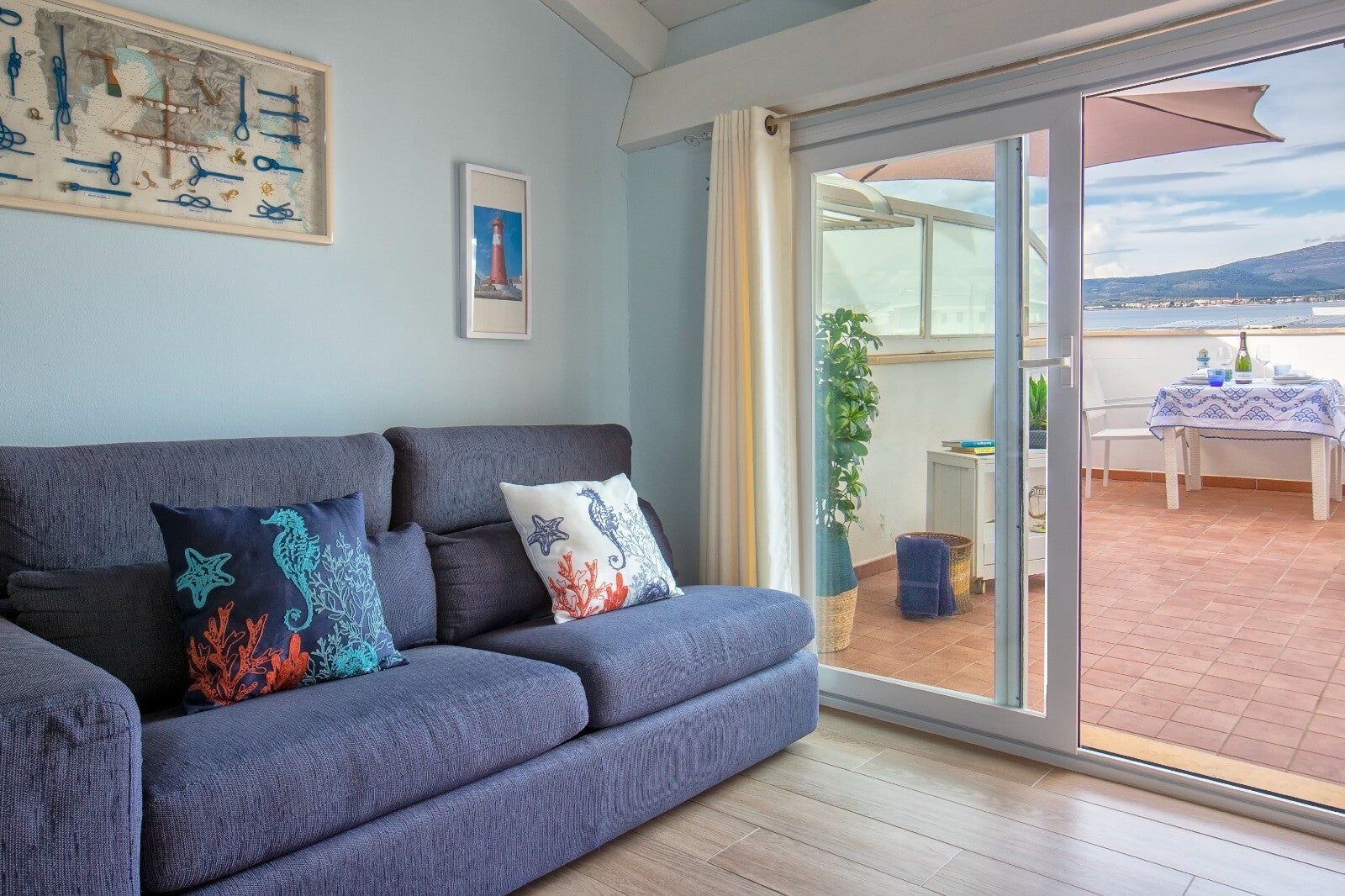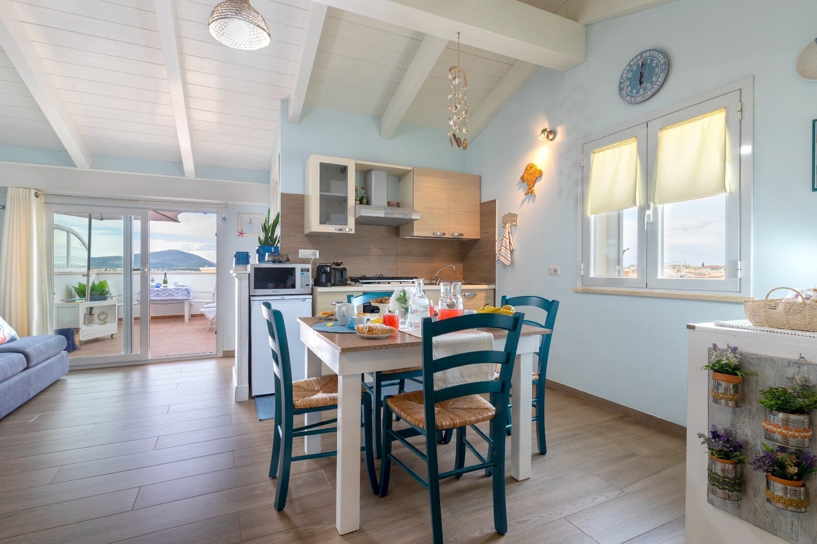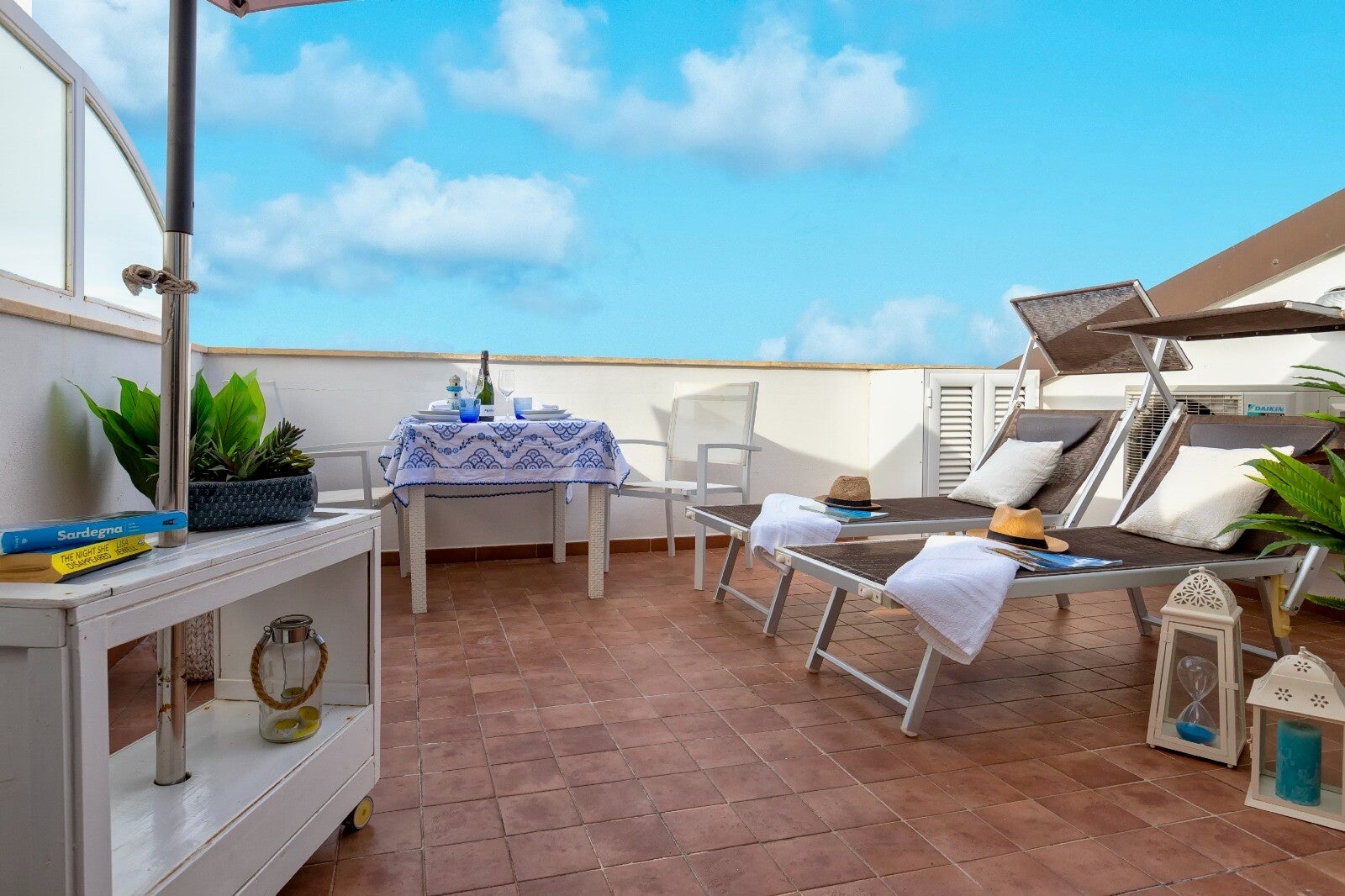Godetevi un'esperienza rilassante con la terrazza panoramica dotata di lettini prendisole, tavolo e sedie. Perfetta per cene al tramonto con vista mozzafiato su Capo Caccia.